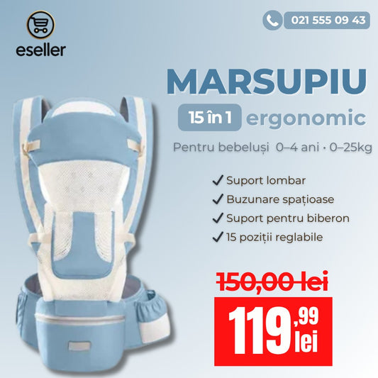 Marsupiu ergonomic, multifunctional pentru bebelusi, 15in1, greutate maxima 25 kg, Albastru