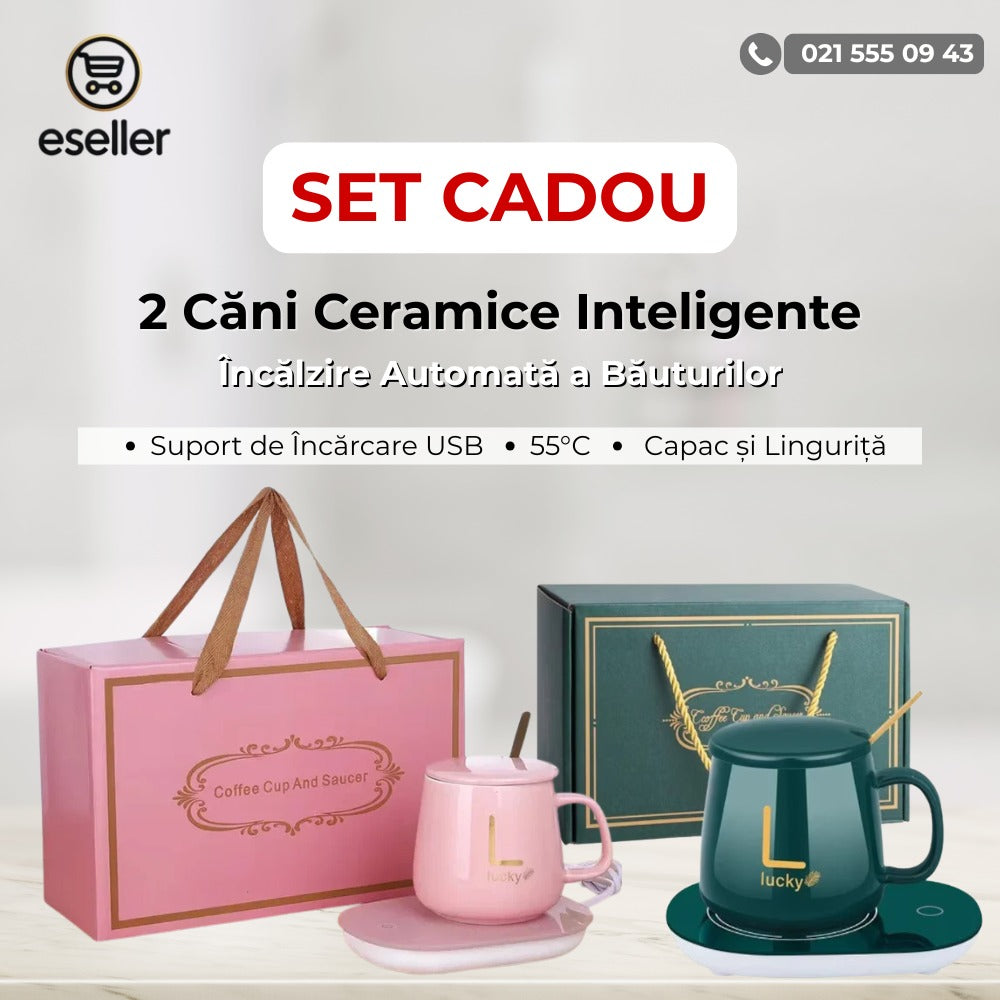 Set Cadou 2 Căni Ceramice Inteligente pentru Încălzire Automată a Băuturilor - Verde Regal + Roz, 400 ml, pentru Cafea, Lapte, Ceai, cu Suport de Încărcare USB, 55°C, Capac și Linguriță"